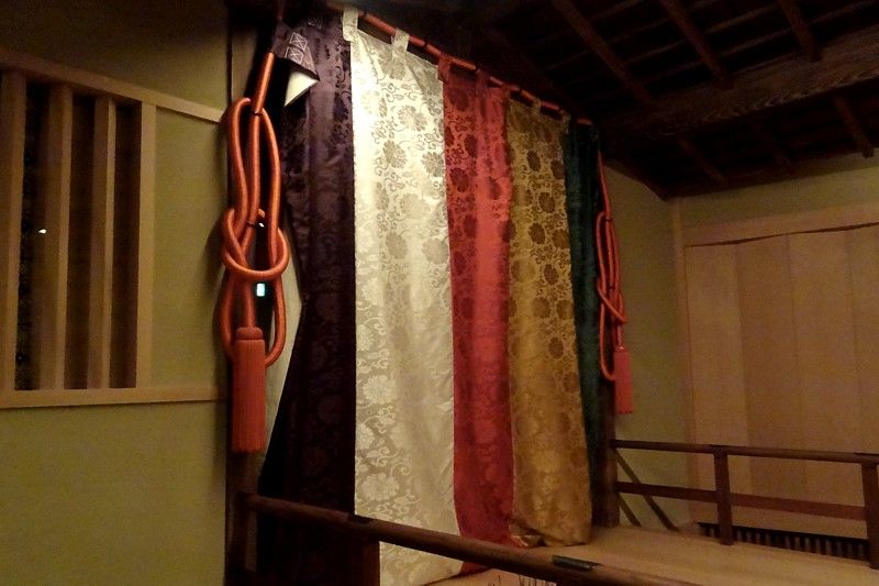 絹の色彩豊かな揚げ幕(舞台から見て「花道(はなみち)」の突き当たりにかかっている幕)